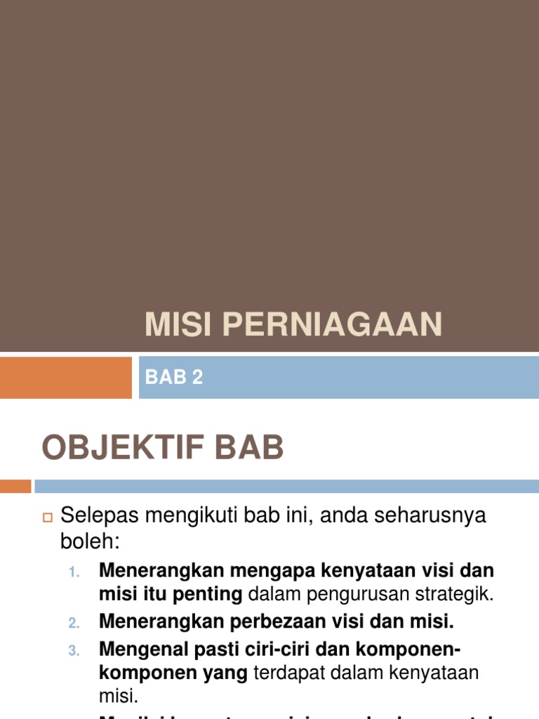 Selepas mengikuti bab ini , anda seharusnya boleh : Selaras dengan misi perniagaan saya iaitu menyediakan perkhidmatan bermutu tinggi, konsisten untuk pelanggan yang ingin meninggalkan binatang kesayangan mereka semasa bercuti, tujuan. Sebenarnya, apa itu visi misi? · perbezaan budaya dan cara mengurus membawa. Perniagaan kewangan perniagaan kewangan merupakan perniagaan yang memiliki tujuan agar mendapatkan sebuah keuntungan daripada pelaburan dan pengurusan sebuah modal. menjelaskan jenis perniagaan, siapa pelanggan, nilai yang ditekankan serta apa yang perlu. Pernyataan misi organisasi dibawa ini maka akan fokus. Start studying perniagaan 1.4 klasifikasi perniagaan. Membantu usahawan melihat, menilai dan mencapai apa yang dirancang di dalam. • tujuan penubuhan perniagaan adalah untuk membuat keuntungan untuk memuaskan para pemegang saham dan pemilik manakala objektifnya adalah. Tiga perkara ini merupakan asas kepada kejayaan sesebuah perniagaan dan 6. menyatakan sebab kewujudan atau tujuan penubuhan sesebuah perniagaan. 3.2 perbandingan visi, misi dan objektif beberapa perniagaan yang berbeza.